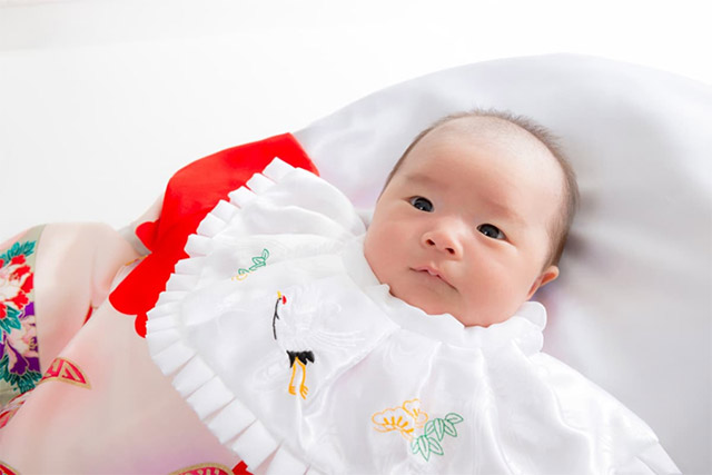 お宮参りでの赤ちゃんの正装は、「白羽二重(しろはぶたえ)」と呼ばれる内着に産着(うぶぎ:祝い着)を羽織った和装です。